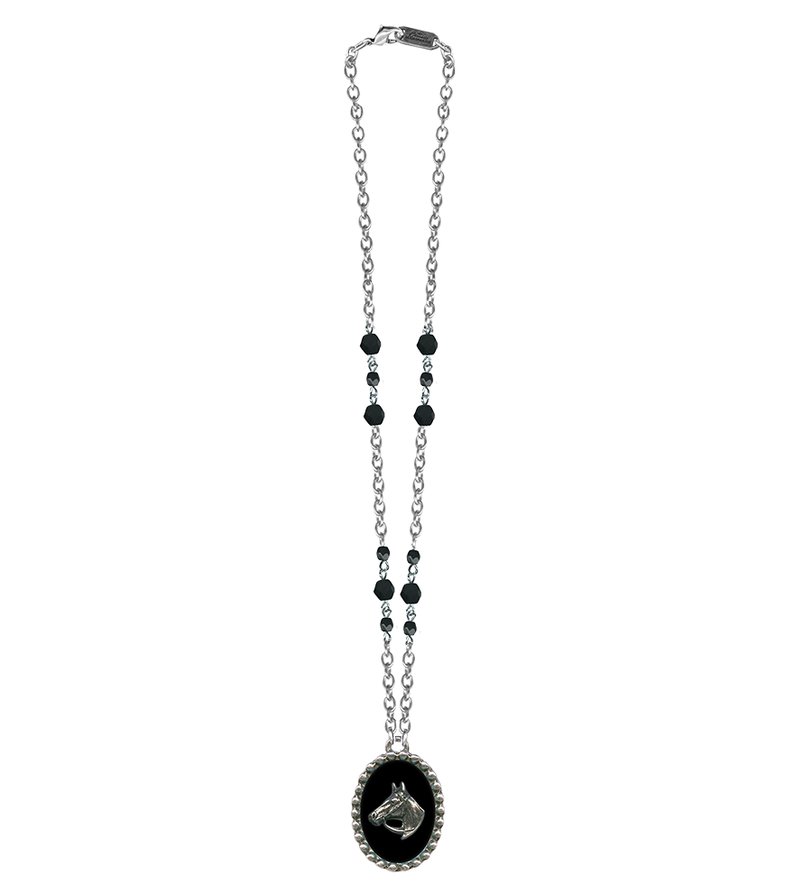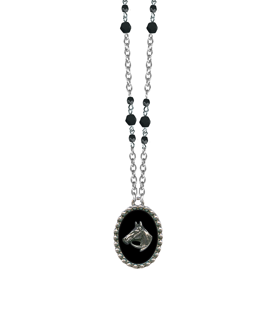 Add a touch of western style with our horse silhouette necklace! The oval shaped charm pendant has a classic silver horse head on a black painted background with hand poured resin and lovely jet glass beads that reside on a surgical steel chain.