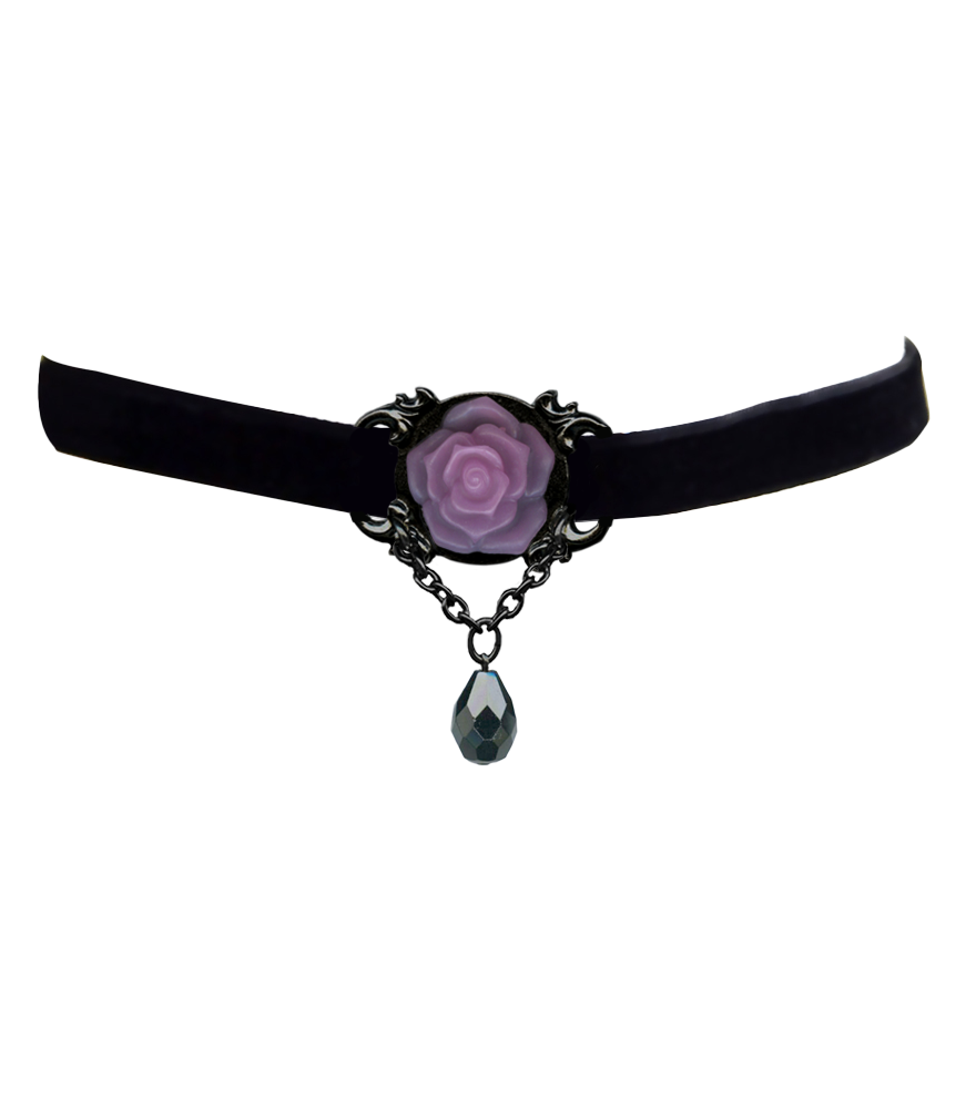 - Materials: Velvet ribbon, metal setting, resin flower, glass/jet bead, black enamel chain, surgical steel chain.