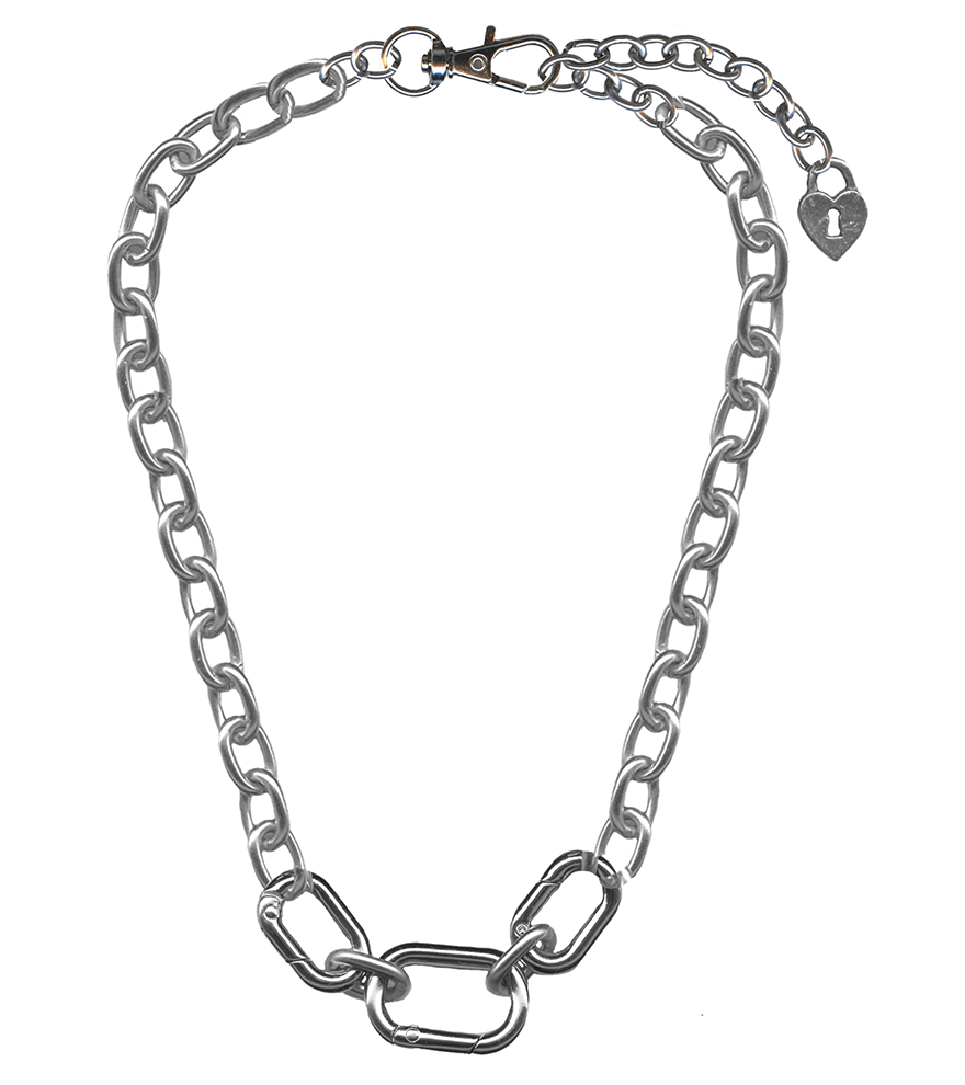 Bold, modern, and unmistakably industrial — this silver tone chain necklace features three polished carabiner-style links at the center, creating a striking hardware-inspired focal point.