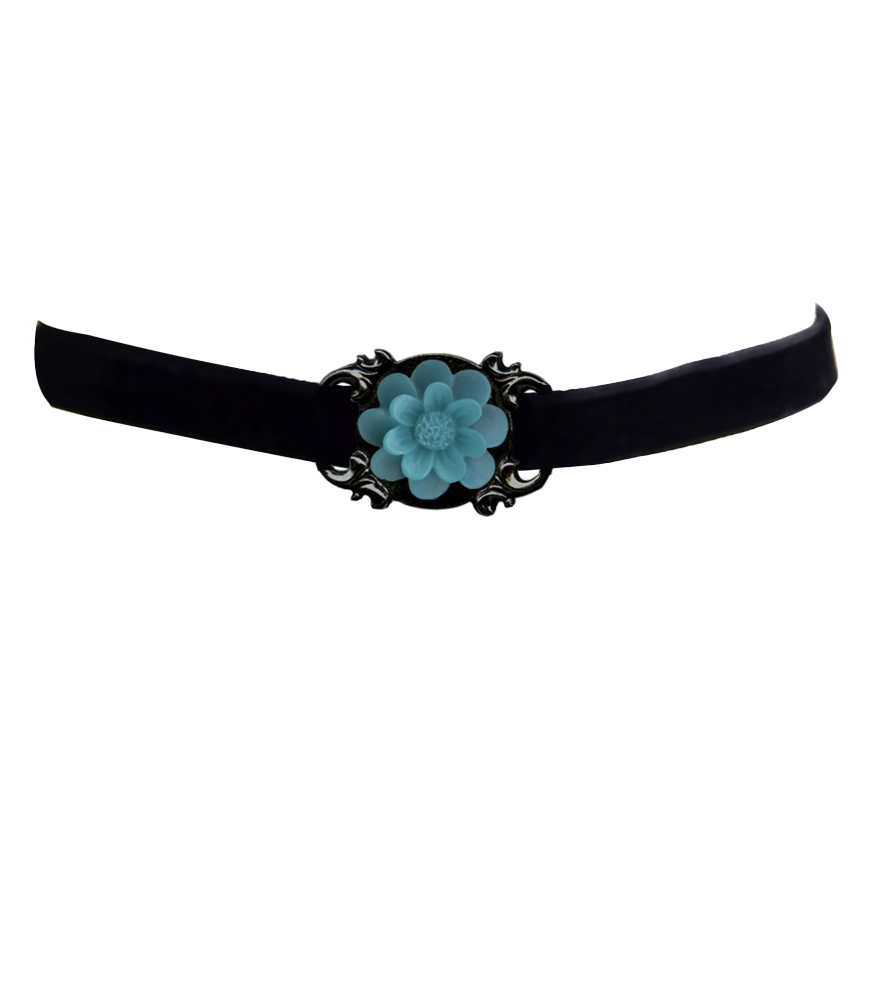 Soft velvet meets vintage charm in this elegant teal flower choker. The delicate floral center sits on rich black velvet with an adjustable chain for a comfortable, custom fit.
