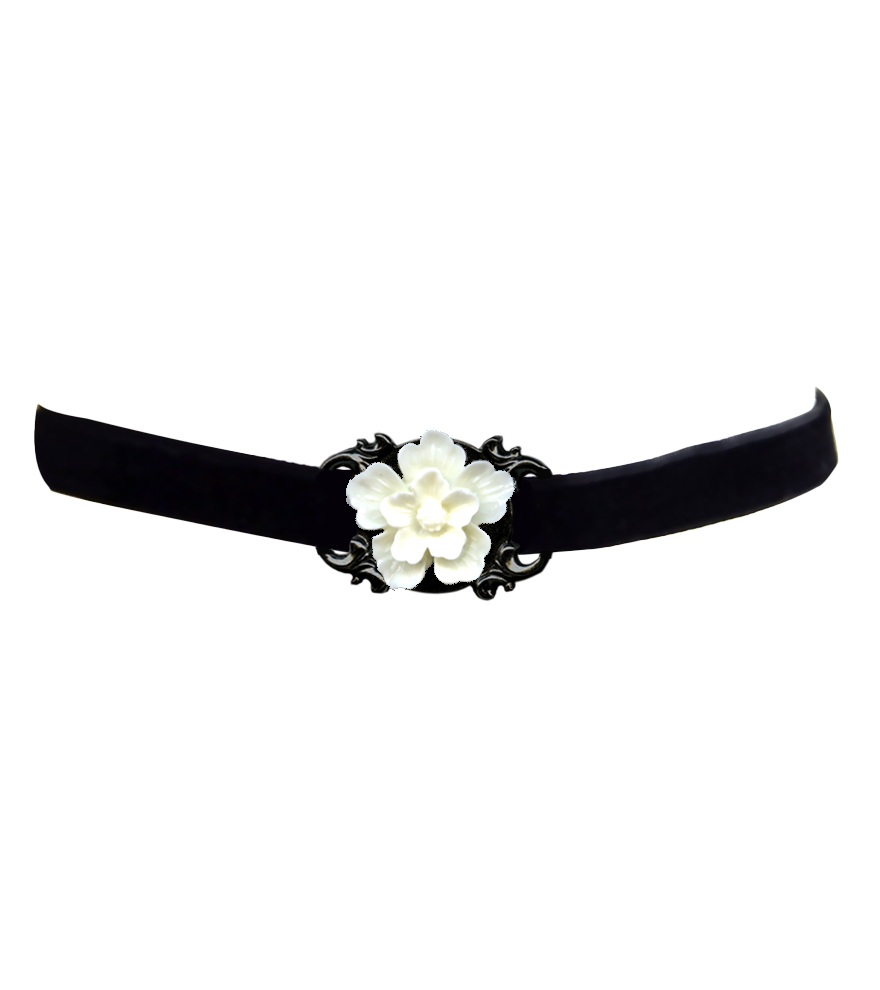 -Soft black velvet band with detailed white flower centerpiece
