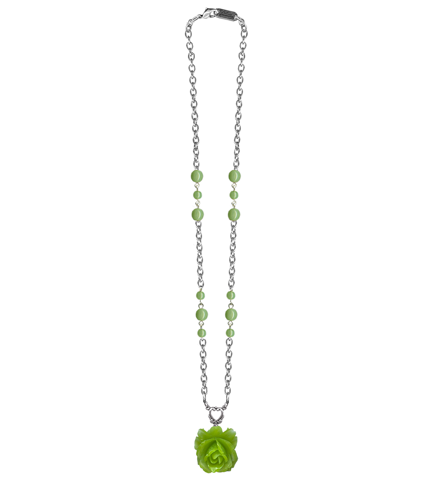 Always classic and stylish Retrolite Small Rosary Rose Necklace! A great statement piece that can be worn day or night. Looks fabulous with a v or plunging neckline or can be worn with a turtle neck too! Match it up with one of our Retrolite rose barrettes or earrings to complete the look.