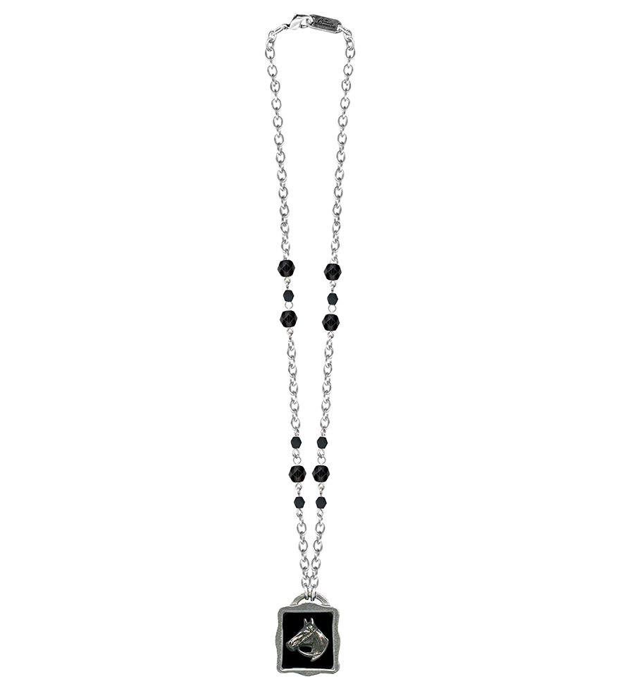 Handcrafted in our Los Angeles studio, the Shadow Box Horse necklace brings a touch of equestrian elegance to your jewelry collection. Featuring a detailed horse design on a silver-plated pendant, this piece is beautifully accented with jet glass beads.