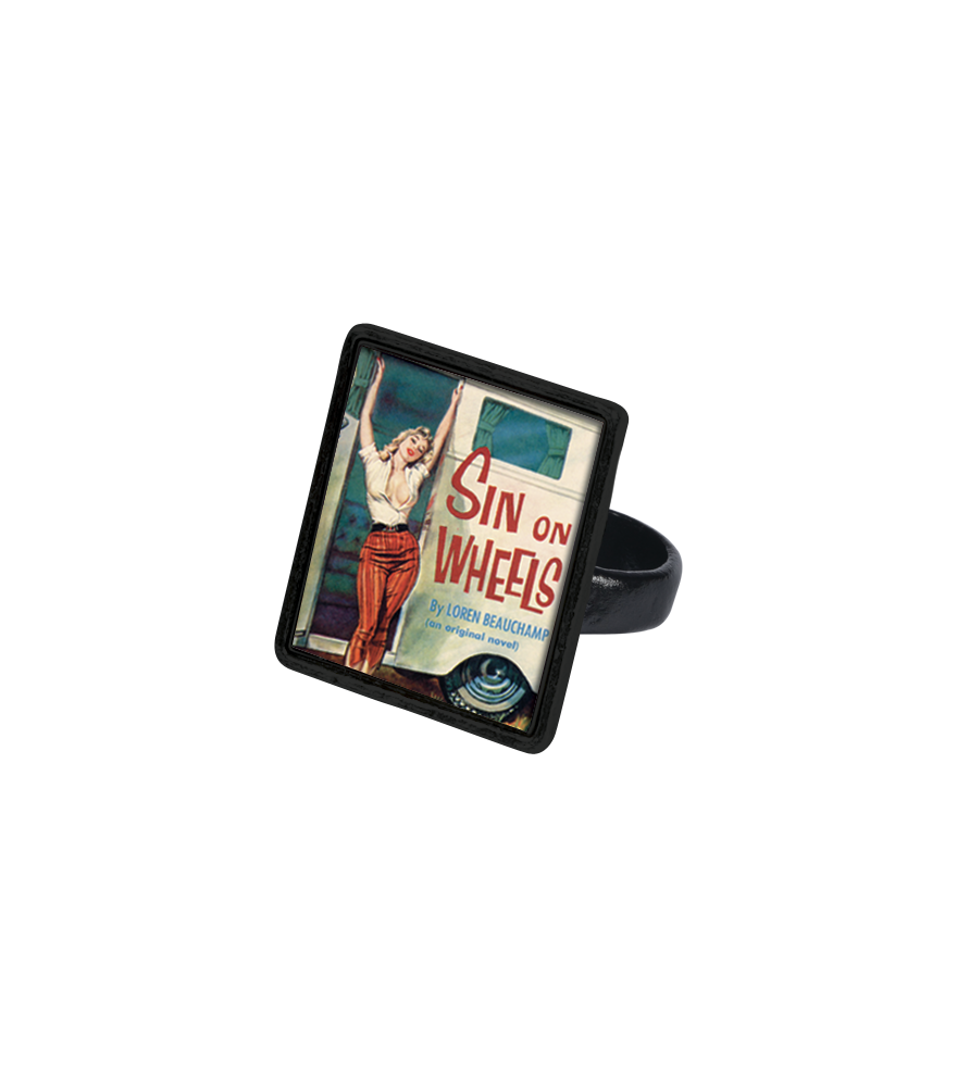 Add a touch of retro intrigue with this striking Sin on Wheels Vintageware Ring. Featuring bold artwork inspired by classic pulp fiction, this ring is a conversation-starting accessory for lovers of vintage style. Its rectangular design highlights the vibrant imagery, set in a durable silver-plated or black enamel frame.