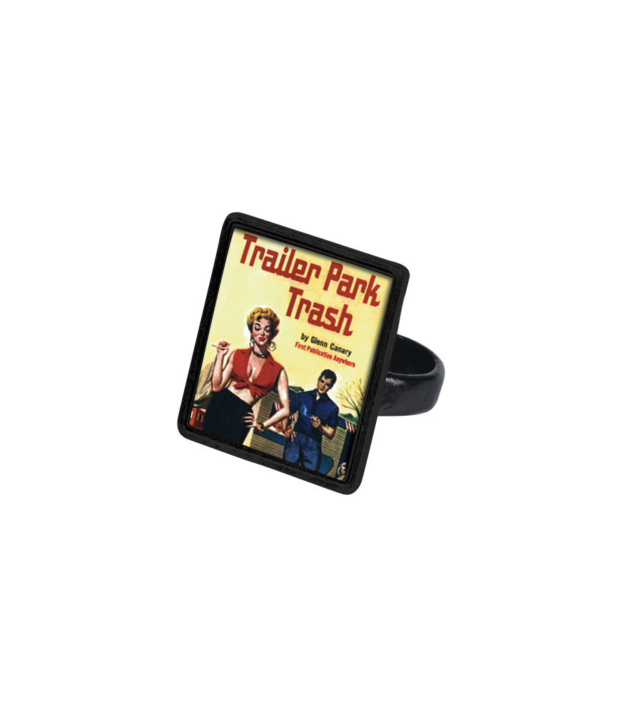 Embrace a playful nod to kitschy nostalgia with our Trailer Park Trash Vintageware Ring! This cheeky design, inspired by retro paperback covers, is a conversation starter for bold, vintage-loving souls.